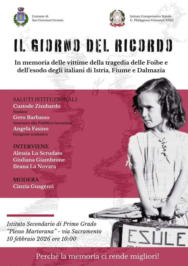 In occasione del Giorno del Ricordo, il Comune di San Giovanni Gemini e l’Istituto Comprensivo Statale G. Philipponne:Giovanni XXIII promuovono un momento di riflessione e dialogo formativo con gli studenti, dedicato alla memoria delle vittime della tragedia delle Foibe e dell’esodo degli italiani d